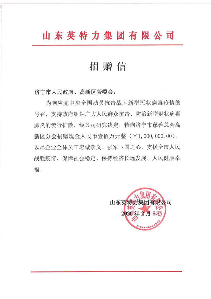 自新型冠狀肺炎疫情爆發(fā)以來,一向牽動著英特力人的心。2月6日山東英特力集團有限公司特向濟寧市慈善總會高新區(qū)分會捐贈現(xiàn)金人民幣壹佰萬元整(¥1,000,000.00),以盡企業(yè)全體員工忠誠孝義、強軍衛(wèi)國之心,支援全市人民克服疫情、保障社會穩(wěn)固、人民健康幸福! 眾擎易舉、共克時艱。在黨中間、各級當局同一頑強的向?qū)拢⑻亓θ藢⒗^承積極自動承擔起同舟共濟的社會責任,與全國人民一路齊心協(xié)力打贏這場疫情防控戰(zhàn)。 |